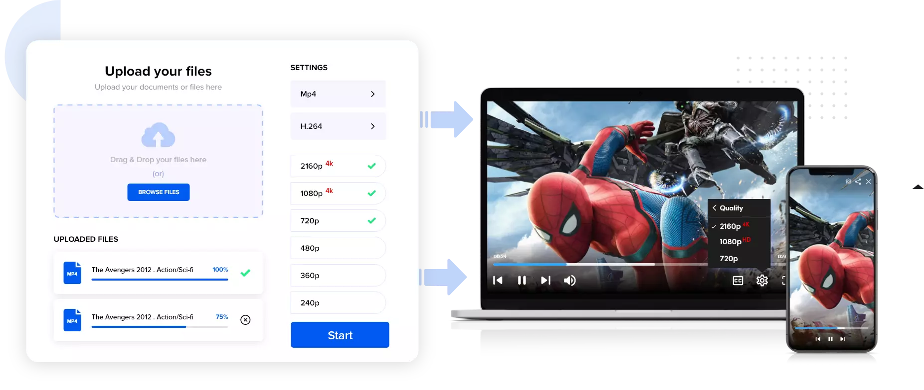 Encode instantly in multiple bitrates, formats and codecs to get support on multiple platforms, devices and browsers, thereby amplifying your audience on a global scale.